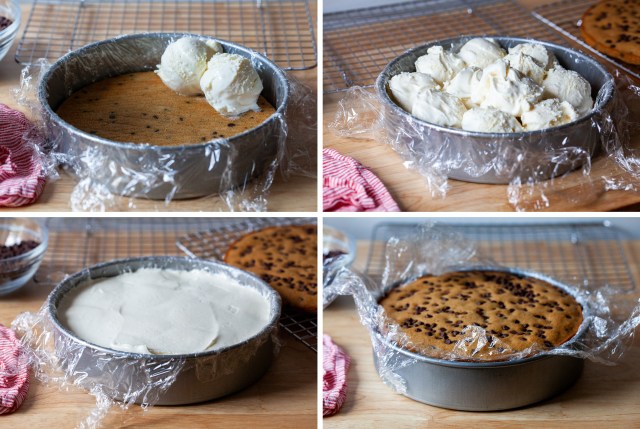 Place first chocolate chip cookie round top side down in the bottom of the pan. Scoop vanilla ice cream all over and use a spatula to spread it evenly. Place second chocolate chip cookie top side up on top and press it firmly against the ice cream. Use any plastic that has extended over the sides to cover the cookie, but it’s okay if it’s not fully covered.