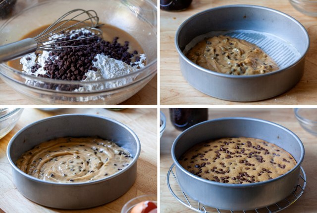 Pour half the batter into each pan and smooth the top flat. Sprinkle the tops of each round with 2 tablespoons of the chocolate chips.