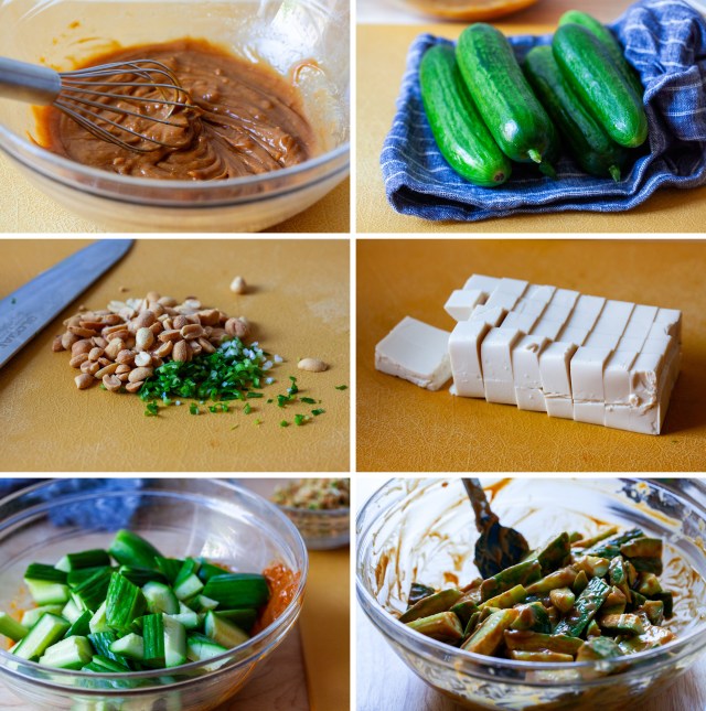 Prepare the vegetables and tofu: Cut the cucumbers in half lengthwise, then each half three more times into long wedge-shaped pieces (i.e. 6 long pieces per cucumber). Cut them into 1 1/2-inch lengths on a diagonal and add them to the big bowl with the dressing.