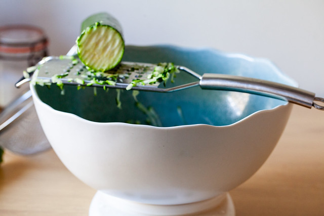 - 2 cups (13 ounces or 370 grams) grated, packed zucchini, not wrung out, grated on the large holes of a box grater